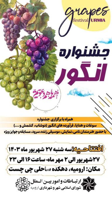 صدای گوگان، جشنواره انگور ارومیه با تلفیقی از سنت‌های بومی، جاذبه‌های گردشگری و برنامه‌های فرهنگی هنری، از ساعت ۱۶ تا ۲۴ هر روز در دهکده ساحلی چی‌چست برگزار می‌شود.