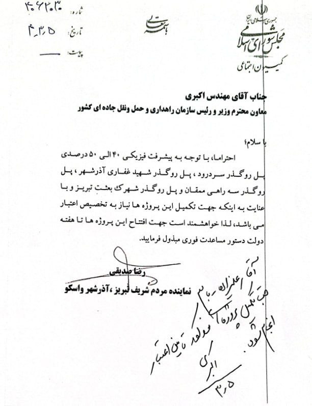 در این نامه، با اشاره به پیشرفت فیزیکی ۴۰ تا ۵۰ درصدی پروژههای مهم راهداری از جمله پلهای روگذر سردرود، شهید غفاری آذرشهر، سهراهی ممقان و شهرک بعثت تبریز، درخواست تخصیص اعتبار لازم برای تسریع در تکمیل و بهرهبرداری از این پروژهها مطرح شده است.